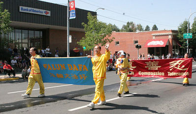 法轮功学员在西雅图与蒙若小城人民共庆百年大庆,图为法轮功的游行队伍2006-8-23