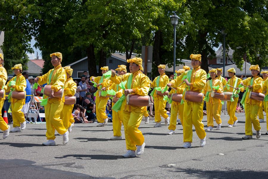 法轮功学员参加华盛顿州柯克兰国庆游行,舞狮,花车、腰鼓队和唐鼓, 获第一名