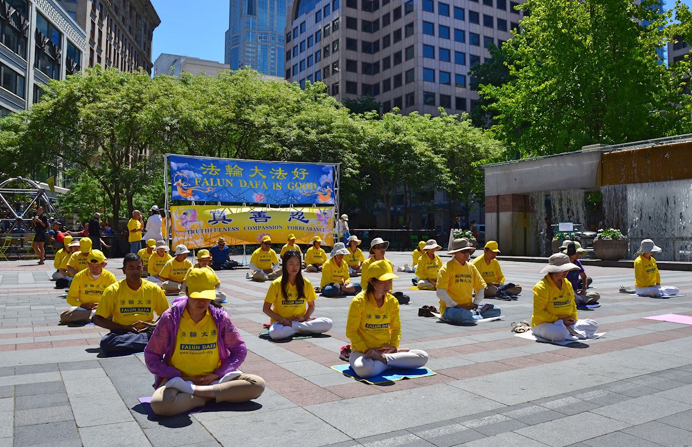 法轮功学员聚集在西雅图市中心Westlake Park举行集体炼功,传播真相