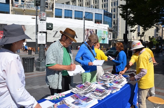 法轮功学员在西雅图市中心举办反迫害征签活动
