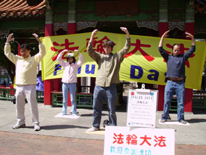 法轮功学员在西雅图集贸市场靠近海岸边小山坡坚持炼功洪法