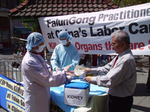 法轮功学员在西雅图Westlake Park参加世界反酷刑日,图为演示活摘器官的残酷行径。2006-6-24