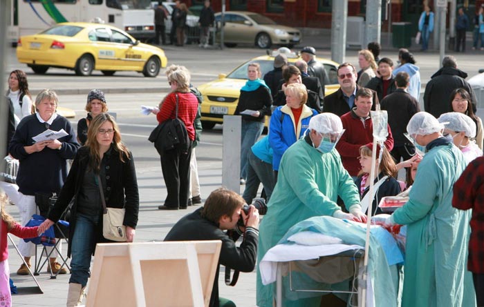 澳洲学员在墨尔本市中心举行大游行 呼吁世人识中共邪恶共同制止迫害 图为活摘法轮功学员器官暴行的演示2006-7-22