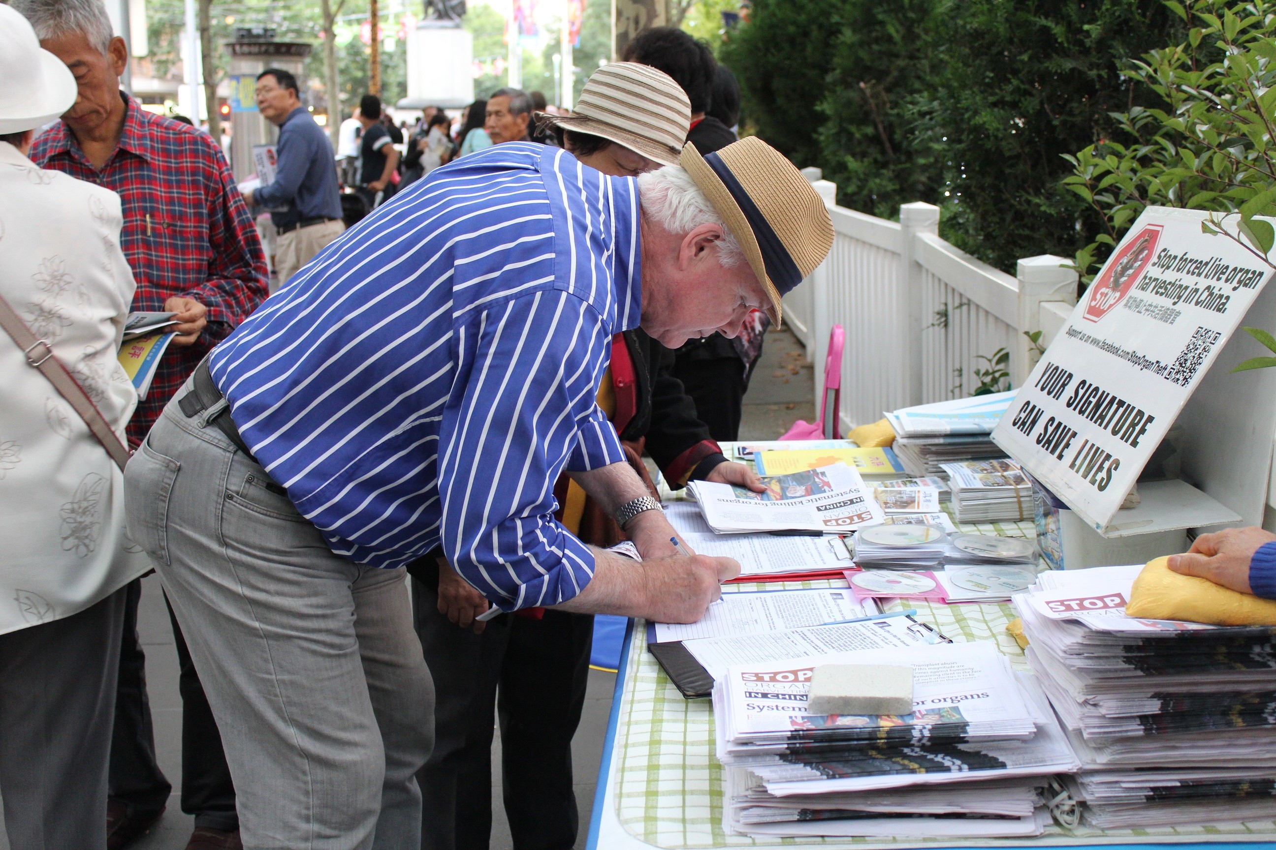 很多过往的民众在呼吁停止迫害、停止活摘的请愿信上签名,称赞法轮功学员的义举