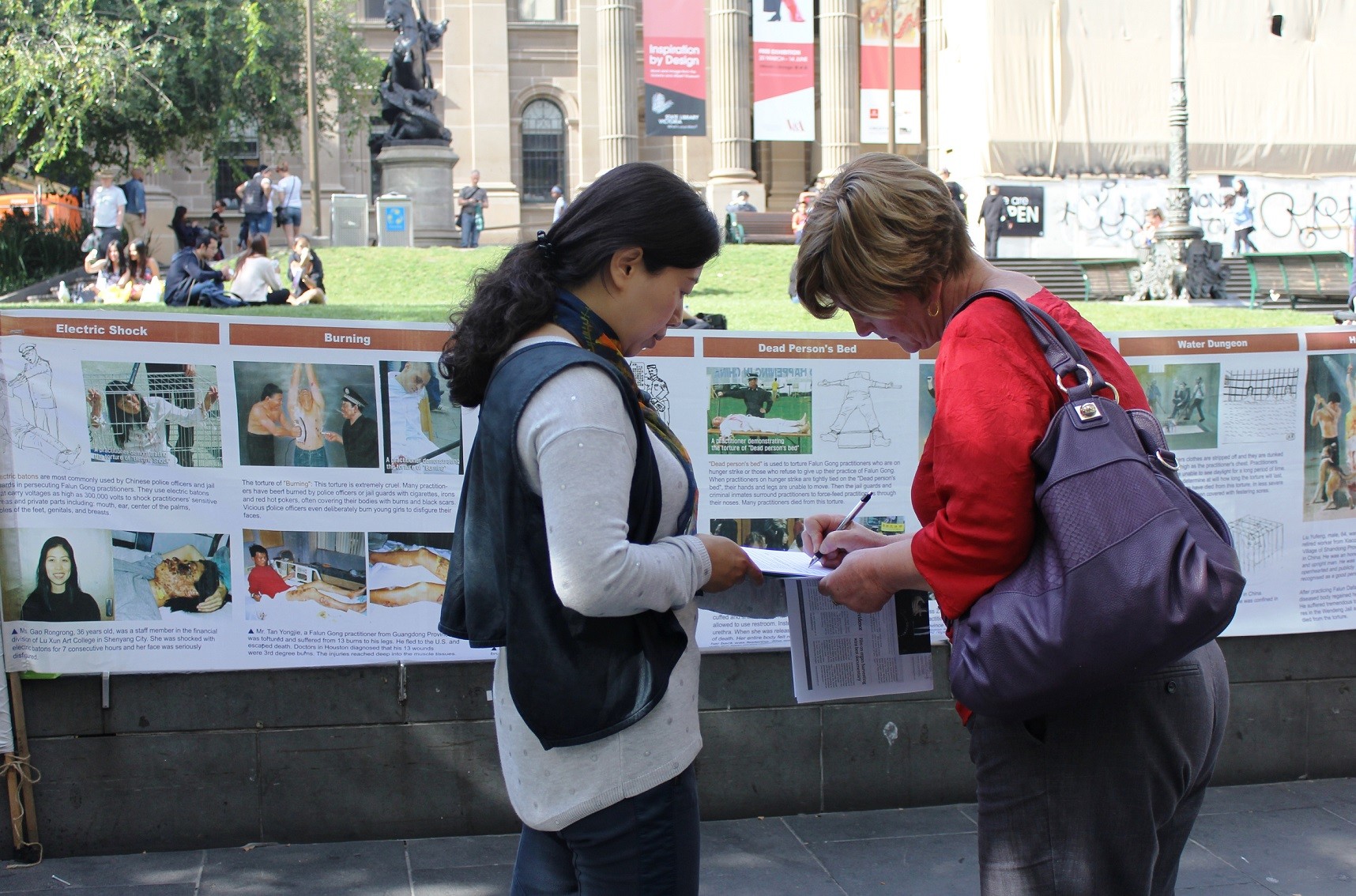 位于繁华市中心的省立图书馆(State Library)前,墨尔本法轮功学员利用周末时间向民众讲真相和征集反迫害签名
