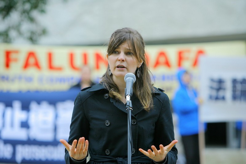 法轮功真相调查团(CIFPG)代表Leigh Smith女士在集会上发言