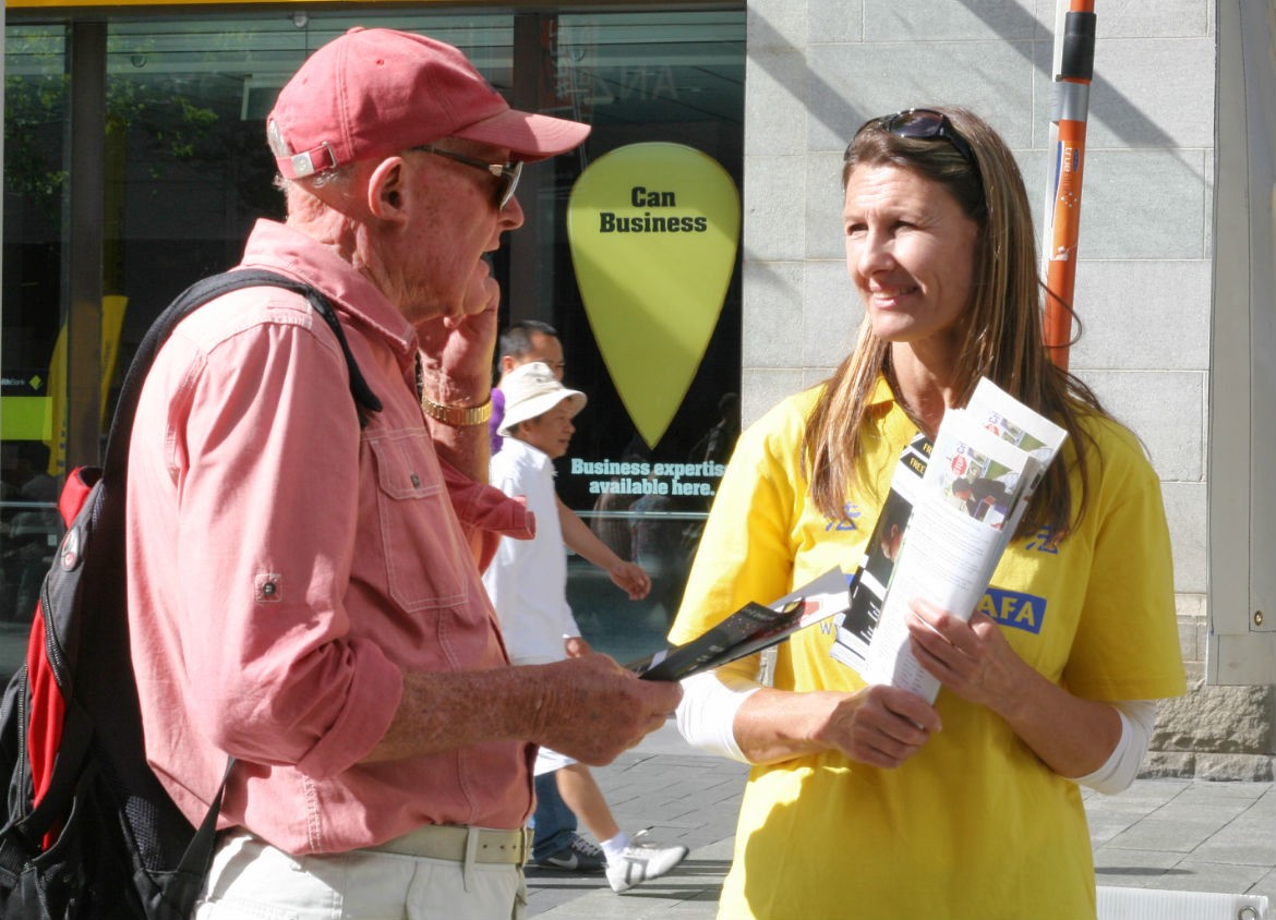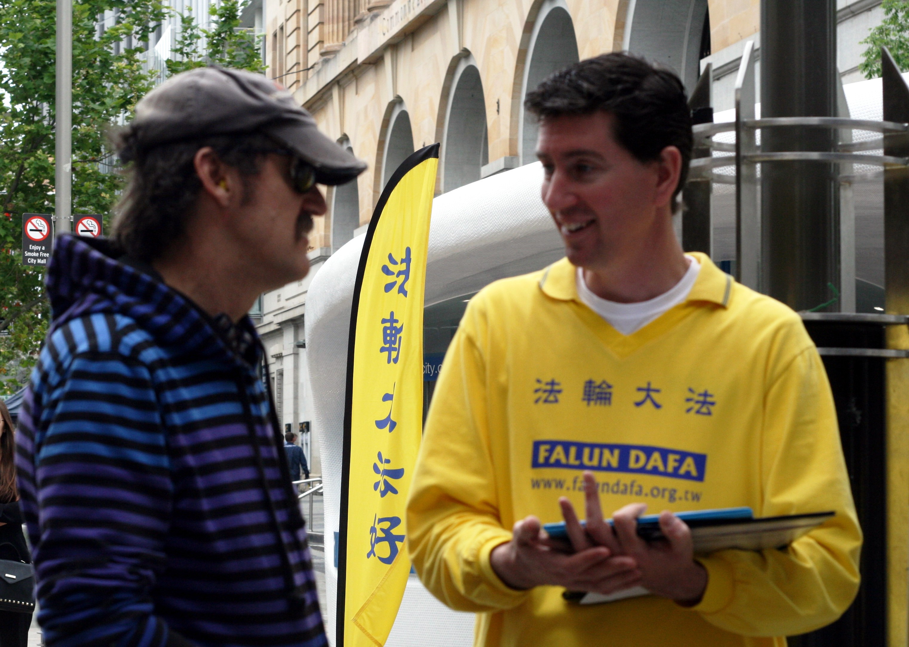 西澳企业家马克.哈奇森(左)在街头向民众讲述法轮功真相