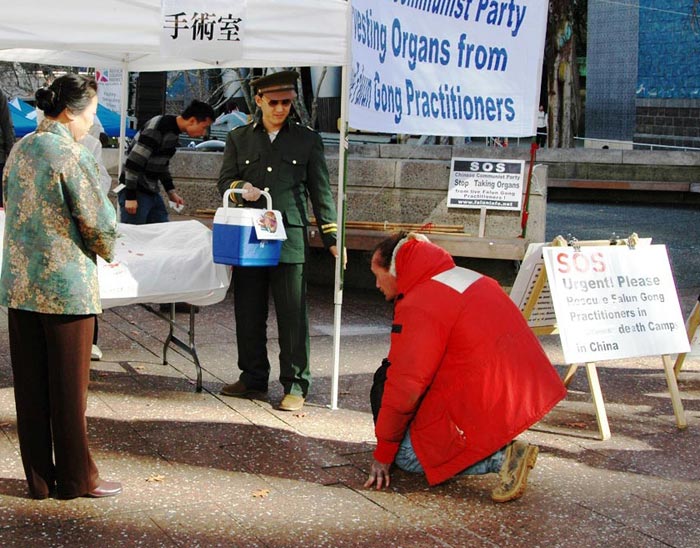 新西兰法轮功学员在惠灵顿火车站抗议中共活体摘取法轮功学员器官 图为演示中共活体盗取器官的罪行2006-6