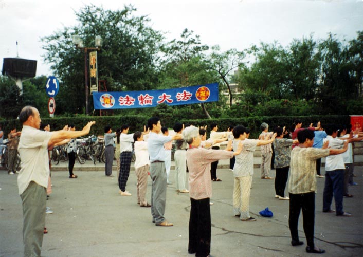 1999年7.20以前东北某地大法弟子集体炼功场面 在法轮功遭受镇压之前,数千名法轮大法学员在唐山纪念碑广场炼功洪法