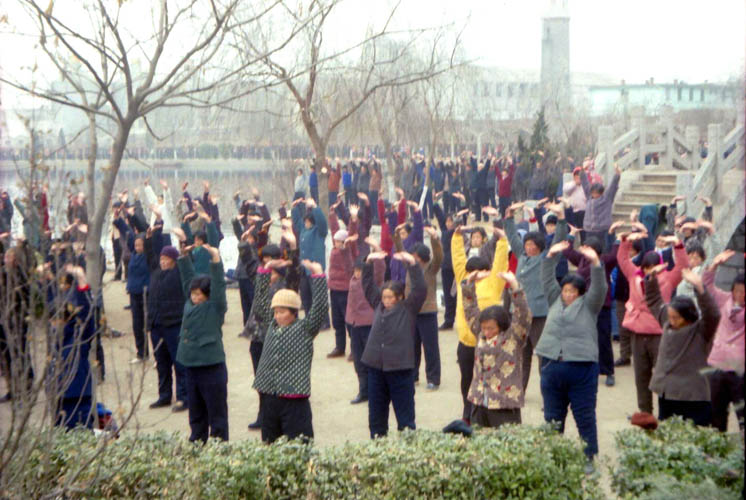 一九九八年元旦数千名蒙阴法轮功学员在县城中心的汶溪公园集体炼功的历史图片