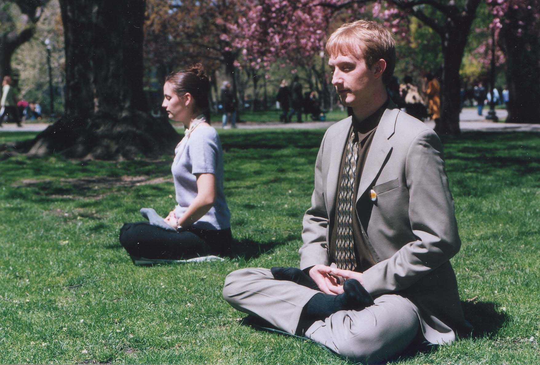 加拿大法轮功学员,克里斯丁和杰森孪生兄妹在炼功,他们分别到过天安门为法轮功和平请愿