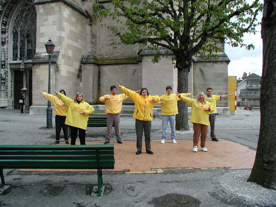 在人权会期间 法轮功学员在日内瓦炼功洪法 瑞士 日内瓦 2001-4