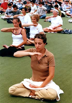 在欧洲法轮大法修炼心得交流会期间,学员们在炼功 法国 巴黎
