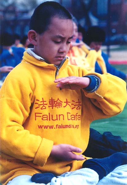 法轮功学员参加2002年华盛顿DC樱花节游行期间,小弟子炼功