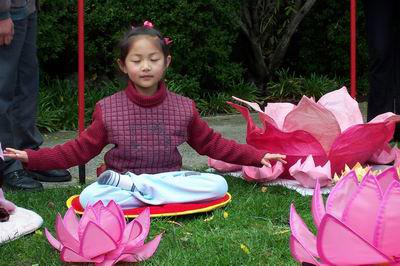 世界性活动“和平的花瓣”在澳大利亚墨尔本拉开帷幕 图为小弟子端坐莲花之中炼功(2003年10月)