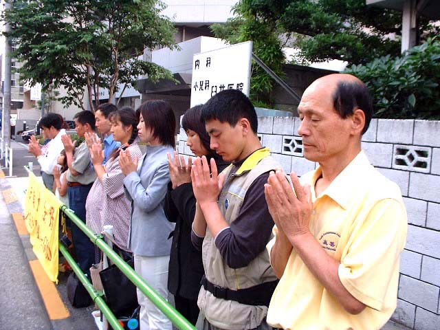 日本法轮功学员持续在中国大使馆前和平请愿,图为学员集体发正念 日本