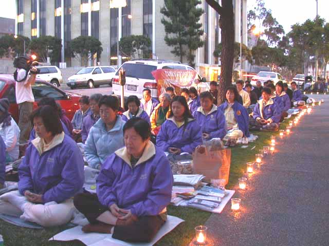 纪念“4.25”和平上访三周年洛杉矶学员中领馆前烛光守夜,图为学员集体发正念 美国 洛杉矶 2002-4