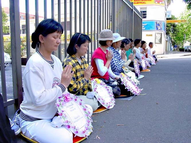悉尼法轮功学员坚持每天持续在中领馆前和平请愿,图为学员发正念 澳大利亚 2002-10
