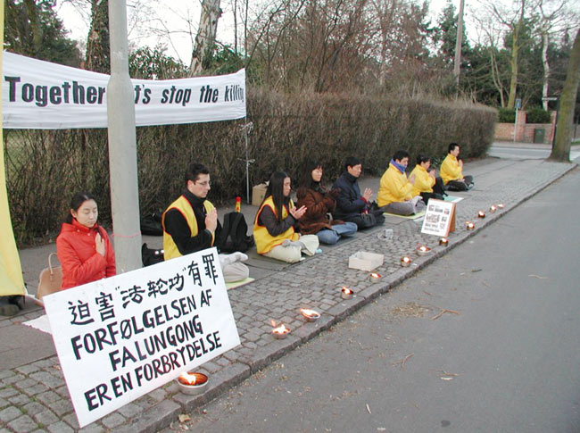 丹麦法轮功学员在中国使馆前发正念,支持对江××的正义起诉 丹麦 2003-4
