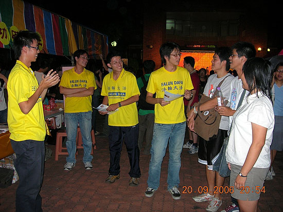 台湾学员在成大迎新活动上展现大法的美好图为学员向学生们讲述迫害的真相2006-9-20至21