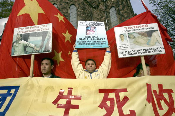 法轮功学员在胡锦涛访问耶鲁大学时高举迫害真相展板呼吁开放调查活体摘取器官的罪行。06-4-21