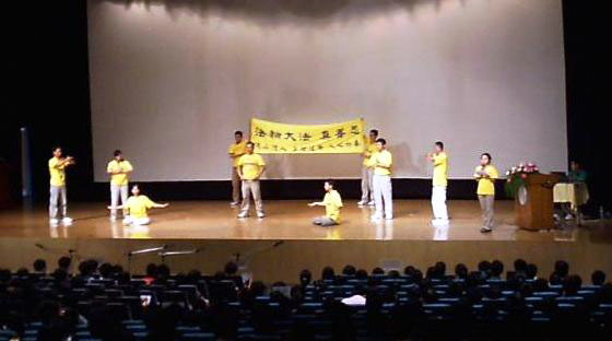 法轮功学员在台湾清华校园新生讲习中洪法讲真相图为学员们演示祥和的功法.