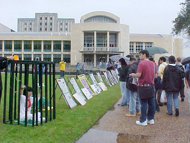 法轮功学员于休斯敦大学雨中举行反酷刑展