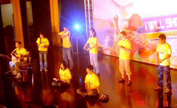 法轮功学员在台湾政治大学迎新洪法并讲真相图为学员演示及介绍舒缓祥和的功法2007-9