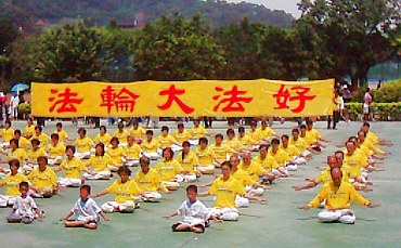 法轮大法洪传台湾---图为台北小弟子在有木国小校庆时集体炼功洪法