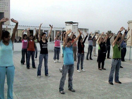法轮功学员应土耳其墨尔逊市学校校长邀请专题介绍法轮功图为教授优美舒缓的五套功法