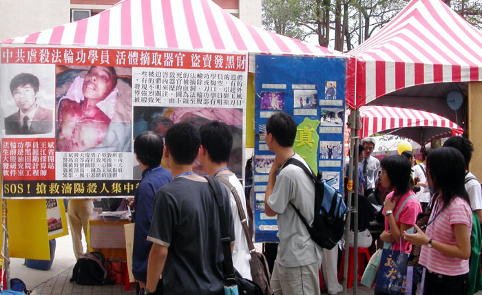 法轮功学员在台湾交通大学校庆期间讲真相,图为许多来参与园游会的学生对中共虐杀法轮功学员感到震惊 2006-4