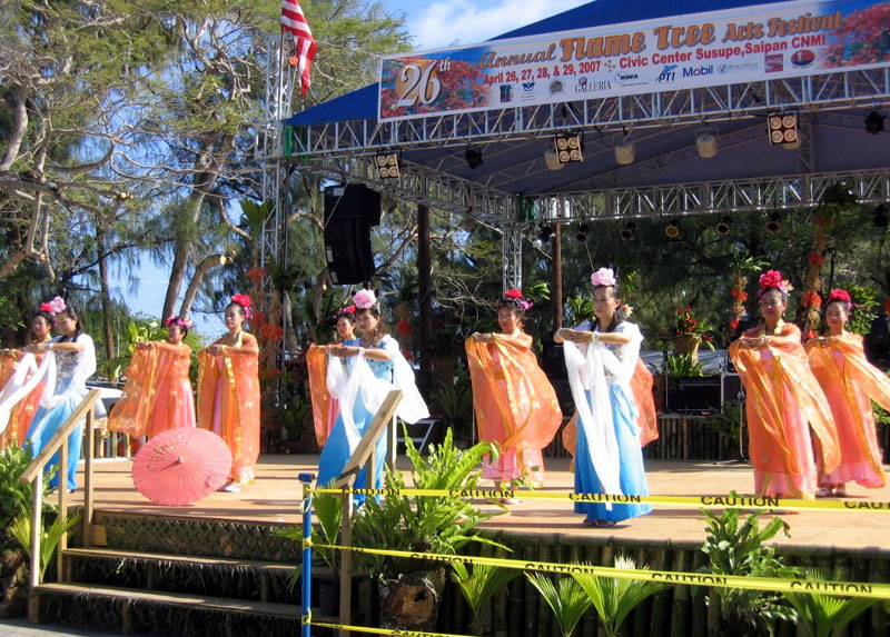 法轮功学员在塞班火树艺术节展开洪法讲真相活动图为学员表演唐装舞蹈