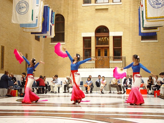新英格兰学员在麻州政府办公大楼举办答谢会,感谢各界人士,特别是麻州政府官员四年多来对法轮功的支持,图为学员表演舞蹈 美国 2003-6-30