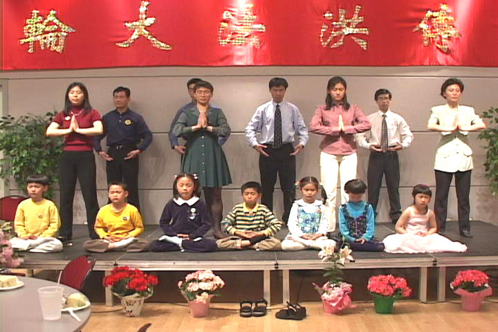 温哥华法轮功学员举办欢庆晚宴庆祝法轮大法洪传世界十周年,大法的美好给宾客留下深刻印象,图为学员的功法表演,加拿大 2002-5