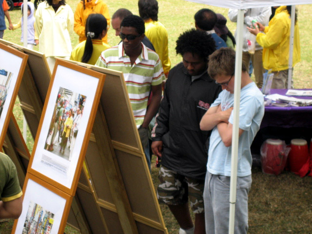 新西兰的法轮功学员参加奥克兰国际文化参观摄影展的观众2006-3-5 台湾在阿里山上举办“正法之路摄影展”大陆观光客在观赏大法真相照片