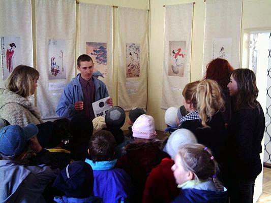 乌克兰法轮功学员在维尼察(Винница)市区艺术博物馆举办了法轮功学员的绘画作品及“正法之路” 图片展 前来参观的人络绎不绝
