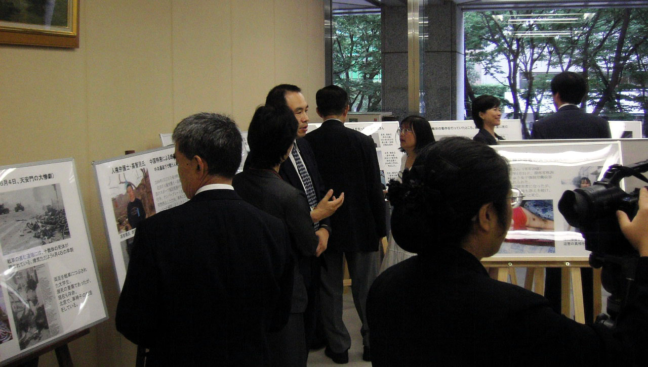 中国人权侵害实况图片绘画展在东京都议会大楼开幕 图为民众参观展览2006-7-20