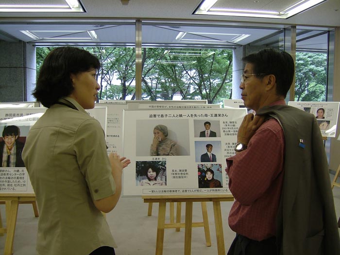 日本法轮大法学会举办中国人权侵害图片绘画展 图为法轮功学员向参观者讲真相 2006-7-20
