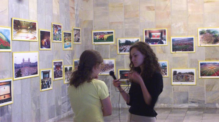 乌克兰法轮大法学员在利沃夫城举办的「法轮大法世界之旅」图片展期间接受记者采访
