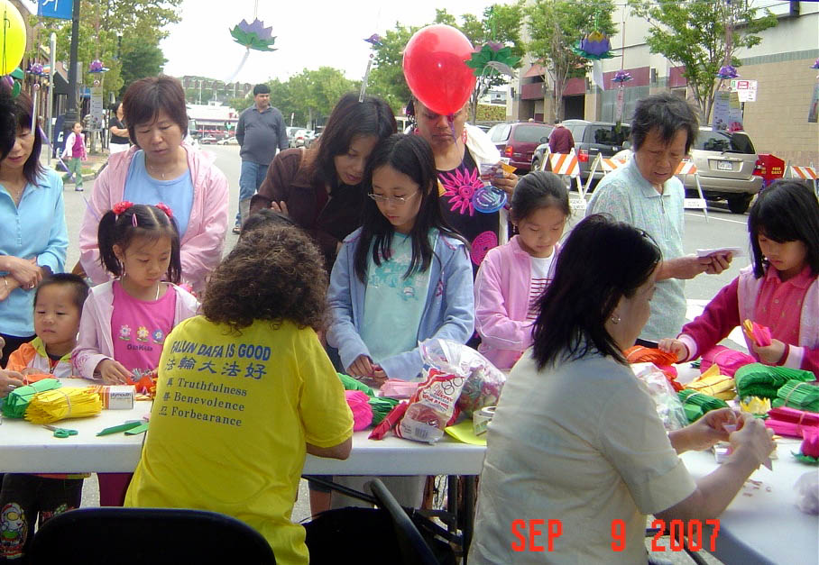法轮功学员应邀参与美国麻州昆西市举办的多元文化节图为民众学做莲花并听大法真相2007-9-9