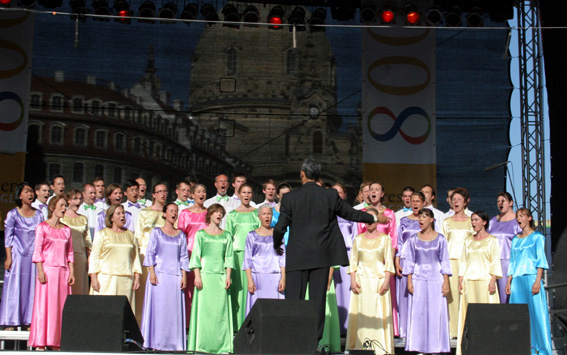 德国大法弟子在Dresden市文化节庆活动上展示法轮大法的美好,图为欧洲合唱团演唱