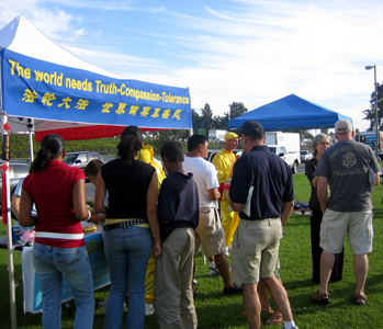 法轮功学员应邀参加圣地亚哥海军基地的多元文化节,图为展位上吸引很多民众2006-9-17
