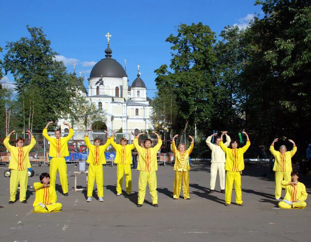 法轮功学员参加莫斯科城市节的庆祝活动图为优美舒缓的法轮功五套功法演示2007-9-1至2