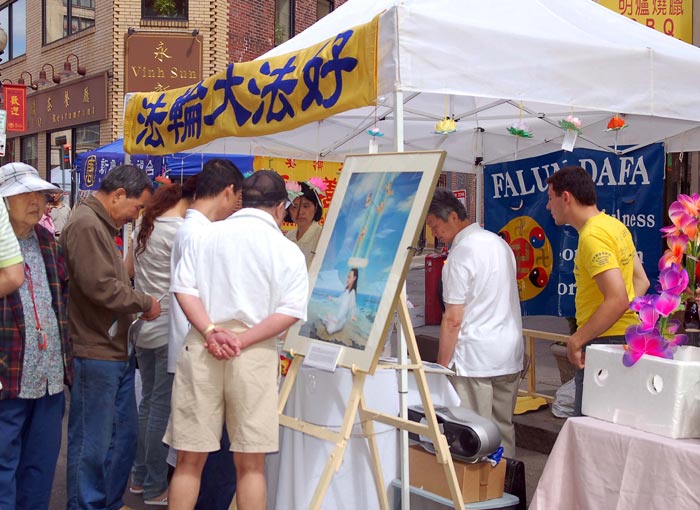 法轮功学员参加波士顿中国城举行的亚洲风情节图为展位前吸引许多民众驻足了解真相2007-7-1