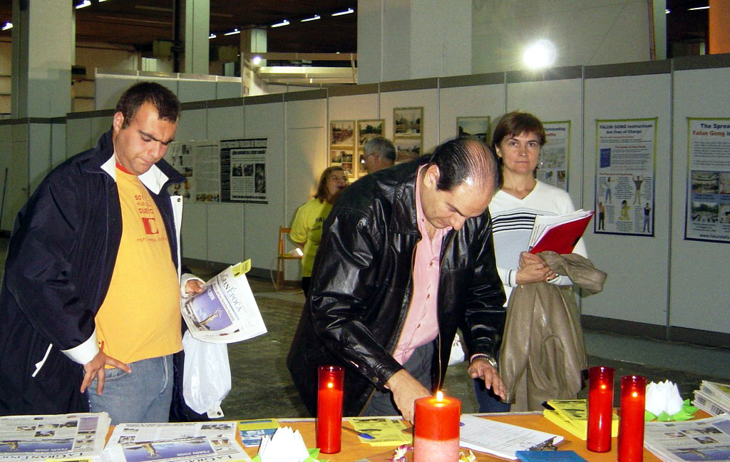西班牙法轮功学员应邀参加巴塞罗那举办的国际健康博览会图为民众签名谴责中共的暴行