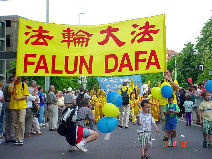 法轮大法优美祥和的场面在莱比锡体操节上吸引众多行人