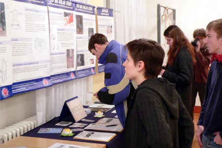 捷克法轮功学员应邀在社区慈善活动中讲真相 图为民众在法轮功的展台了解真相