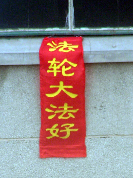 大陆法轮功学员挂在楼道窗户上的横幅