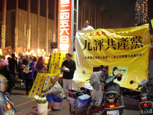 法轮大法洪传台湾县市:图为:嘉义学员在嘉乐福夜市发九评资料