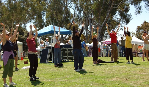 法轮功学员参加美国圣地亚哥“身心灵康复艺术节”在开幕式演示功法并带领观众学功